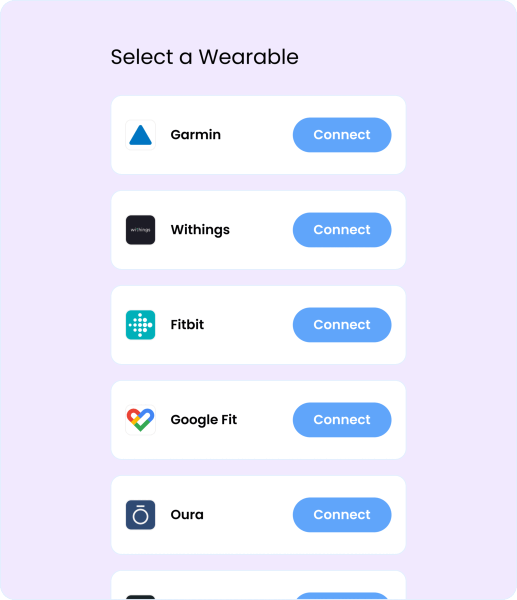 Instant connections to Freestyle libre, Garmin, Fitbit, Oura, Apple, Withings, Polar, Wahoo, Eight Sleep, Training Peaks, Suunto, Zwift, Google, Samsung, Tempo, Wear OS, Concept 2, Peloton and Others. We are adding more daily